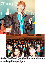 The robe presentation ceremony was then held, marking the commencement of the students’ university lives. Andy Chu Ka-kit, President of the Students’ Union, led the new students as they donned their CityU robes and pledged their commitment to the University.