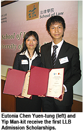 The two recipients of the first-introduced Admission Scholarship were Yip Man-kit of La Salle College and Eutonia Chen Yuen-tung of St Stephen's Girls' College. Both were granted HK$50,000. Eutonia was also awarded the HK$40,000 CityU A+++ Scholarship. Both students scored outstanding Hong Kong Advanced Level (HKAL) examination results and participated in extra-curricula activities to enhance their academic knowledge and cognitive and social skills.