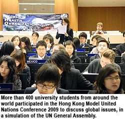 The club is supported by the Office of the Commissioner of the Ministry of Foreign Affairs of the People’s Republic of China in HKSAR, Constitutional and Mainland Affairs Bureau and Education Bureau of the Government of the HKSAR. The 2009 conference attracted more than 400 university students from Hong Kong, mainland China and overseas, who formed more than 50 delegations representing different countries from around the world.