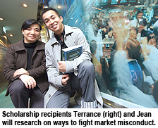 The two PhD students, from the Department of Information Systems, will work on detecting market misconduct such as market manipulation by applying state-of-the-art technologies including artificial intelligence agents and data-mining techniques. The project, scheduled for completion in 2012, will help raise market efficiency and defend integrity. The pair will receive guidance from industry experts at the SFC.