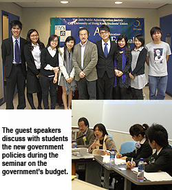 Dr Linda Li Che-lan, Associate Professor from the Department of Public and Social Administration, and Dr Fernando Cheung Chiu-hung, Lecturer from the Department of Applied Social Sciences of The Hong Kong Polytechnic University, were invited to host a seminar to discuss the government’s 2009-10 budget released in February. They discussed with students the new policies relating to local citizens, such as the internship programme for university graduates. The open exchange helped students hone their critical thinking skills. Besides the lectures and seminar, three films were shown to enliven the festival. The screening of three local and overseas films on public affairs provided an alternative channel for students to learn about administration skills.