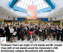On the morning of 2 June, Professor Lam, Mr Chan and conference participants officiated at the unveiling of campus decorations for the CityU 25th anniversary. The giant poster hoisted at the centre of the campus and other decorations around the campus have added to the festive atmosphere.