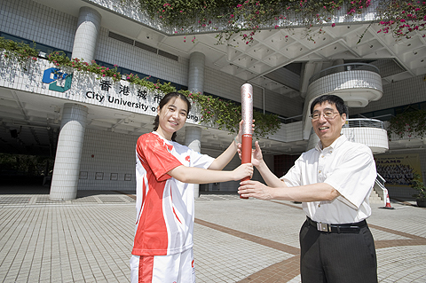 Professor Way Kuo, President of CityU, received the torch from Jamie, who participated in the torch relay in Ordos, Inner Mongolia, during last year’s Beijing Olympic Games. When giving her torch to the University, Jamie relayed her blessings to CityU and wished it all the best in becoming a leading global university. The torch will be displayed at the Sports Complex.