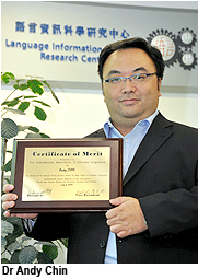 Dr Andy Chin Chi-on, Assistant Scientific Officer at the Language Information Sciences Research Centre (LISRC) of City University of Hong Kong (CityU), won the Young Scholar Award at the 17th Annual Meeting of the International Association of Chinese Linguistics (IACL).