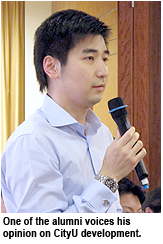 Alumni also took the opportunity to share their appreciation of the University and offer suggestions on raising CityU’s profile. A vision-impaired alumnus thanked CityU for its support to disabled students. Some alumni suggested that CityU build on strategic areas like multimedia to create a competitive edge. An alumnus raised a question on how to encourage CityU graduates and students to be more proud of their University. The President replied that the University would do its best to build mutual trust with the students and alumni in long-term. The University worked hard to improve graduate employability and planned to help alumni engage in life-long learning by granting them access to e-book resources at the library.