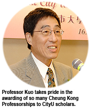 Since 2001, 12 CityU scholars have been elected Cheung Kong Scholars to collaborate with leading mainland universities to develop talent and conduct research during their three-year term. The four recipients for 2008 are Professor Gary Feng Gang, Associate Provost (Academic Planning and Undergraduate Education) and Chair Professor of Mechatronic Engineering; Professor Lai Kin-keung, Chair Professor of Management Science; Professor Wei Kwok-kee, Dean of College of Business and Chair Professor of Information Systems; and Professor Leon J Zhao, Head and Chair Professor of Information Systems. The five academics appointed in 2007 are Chair Professor Chiang Kin-seng in the Department of Electronic Engineering; Dr Li Qiusheng, Associate Professor in the Department of Building and Construction; Chair Professor Zhang Longxi in the Department of Chinese, Translation and Linguistics; Professor Zhou Nan in the Department of Marketing; and Professor Jonathan Zhu Jianhua in the Department of Media and Communication. Chair Professor Chen Guanrong of the Department of Electronic Engineering and Chair Professor Yang Tong of the Department of Mathematics received the Professorship in 2006, while Chair Professor Jia Xiaohua, Department of Computer Science, earned his recognition in 2001.