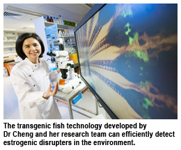An innovative transgenic fish technology developed by City University of Hong Kong (CityU) that can efficiently detect estrogen disrupters in the environment is being exhibited at the Hong Kong Science Museum, showcasing the University’s latest environmental technology to the public.