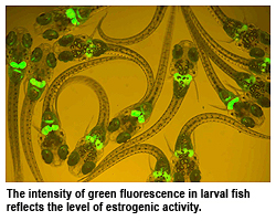 The assay is very simple. Simply expose transgenic larval fish to a test solution, such as environmental water samples or water solution with the test substance added, for 12 to 24 hours. Then check the induced green fluorescence protein expression in the fish liver under a fluorescence microscope. The quantity of expressed green fluorescence protein directly correlates to estrogenic endocrine disruptor concentration and exposure time, and can be quantified by measuring fluorescence intensity.