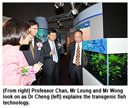 The “Transgenic Fish for Rapid Monitoring of Estrogenic Pollution” exhibition was opened on 5 March at a ceremony officiated by Mr Leung Shiu-keung, Principal Education Officer of the Education Bureau and Advisor to the Hong Kong Science Museum; Mr Michael Wong Hing-lan, Chief Curator of the Hong Kong Science Museum; Professor Chan Chi-hou, Acting Provost and Dr Cheng.