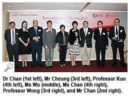 Speakers invited to the forum organised by the Alumni Relations Office were all distinguished CityU alumni, including Mr Wilson Chan Fung-cheung, Assistant General Manager and Chief of Investment and Product Development, Shanghai Commercial Bank, Ms Jenny Chan Pik-ha, Chief Executive Officer of Lippo Securities, Mr Christopher Cheung Wah-fung, Chairman of Christfund Securities, and Ms Agnes Wu Mang-ching, Director of Hong Kong Financial Information Consultant. Dr Chan Yan-chong, Associate Professor at CityU’s Department of Management Sciences and renowned securities commentator, also shared his views on investment as one of the forum panelists.