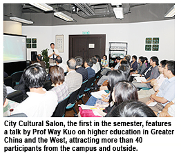 Professor Way Kuo, President of City University of Hong Kong (CityU), shared his views on the differences in higher education between Greater China and Western countries with around 40 guests at the City Cultural Salon organised by CityU’s Cultural and Sports Committee on 28 September.