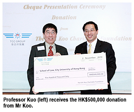 The School of Law (SLW) at City University of Hong Kong (CityU) received a donation worth HK$500,000 from the K H Koo Charitable Foundation on 2 November. The donation will be used to support maritime and transportation law courses.