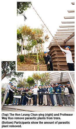 After the opening ceremony, Mr Leung, Professor Kuo and some of the participants helped to remove parasitic plants like cassytha filiformis and weeds in Ma Wan Park. Parasitic vines possess strong reproductive capabilities and feed by extracting nutrients from host plants. This process often results in the gradual withering and even demise of the host. Weeds hurt agricultural production and damage the environment.