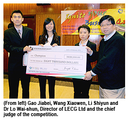 Throughout the competition, we were given a lot of support from CityU faculty and staff. Professor Henry Chung Shu-hung from the Department of Electronic Engineering showed huge interest in authorising students to use his research outcomes to initiate this business adventure. After winning the competition, Mr James Leung Sing-chung, Senior Counselor in Student Development Services, and other judges proposed some constructive ideas. We want to convey our sincere appreciation to them and thank them for the training workshops on creativity, business plan writing, presentation, and entrepreneurship.