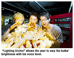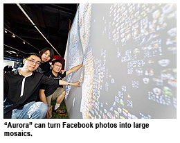 The interactive installation “Aurora” created by Tam Wai-lam, Lee Shu-kit, Tong Pun-kin, and Zhao Yifan, SCM graduates this year, allows visitors to upload photos to computers via Bluetooth or Facebook where they are combined as a large 2.4m by 4.5m mosaic, which is projected onto a semi-transparent soft-cloth screen.