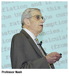 The talk and the Q&A touched on issues as diverse as global currency policies, Islamic banking, the 2008 financial crisis, Keynesian economic theory and of course game theory.Professor Nash won the Nobel Prize for his work on a theory called non-cooperative games interactions between players who cannot form agreements and coalitions. His approach predicts the possible strategies that players might use under optimum circumstances.