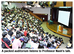 So great was the demand for seats to the talk by Professor John Nash, Nobel Prize winner in economics in 1994 and a legend in the field of game theory, that two extra lecture theatres were set aside for a live TV broadcast.