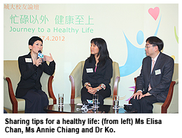 Dr Ko Wing-man, a specialist in orthopaedics and traumatology and a veteran in public health care, and Ms Elisa Chan Kit-ling, a prominent figure in Hong Kong’s music industry and a strong advocate for healthy living and positive life values, were the guest speakers at the forum “Journey to a Healthy Life” hosted by CityU’s Alumni Relations Office. The forum was facilitated by an alumna, Ms Annie Chiang Wai-yu.