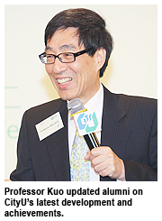 Professor Way Kuo, CityU President, provided an update on the development and achievements of the University for the assembled alumni at the event, such as the appointment of the new Council Chairman, two CityU scientists winning the 2011 Second Class Award in the Natural Science category by the Ministry of Education, and the recent opening of the Run Run Shaw Creative Media Centre, to mention but a few.