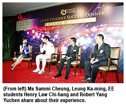 In addition to the presentation of souvenirs to members of the Alumni and Staff Giving Clubs, Leung Ka-ming, a Year 3 applied social studies student and the first épée fencer to represent Hong Kong in the London Olympics; two of the six electronic engineering students selected as interns to provide IT management services at the Olympics; and alumna Miss Sammi Cheung Sau-man who took part in an exchange programme and the Miss Hong Kong Beauty Pageant were invited to share their achievements and experience on stage.