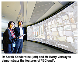 “ECloud” transforms linear browsing of web-based information such as letters and photos into an embodied experience. The project was led by Dr Sarah Kenderdine, Research Director of ALiVE in association with Professor Jeffrey Shaw, Director of ALiVE and Dean of School of Creative Media.