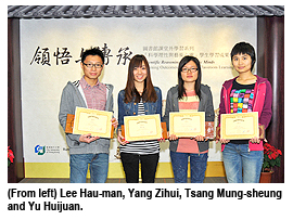 Yu Huijuan (Department of Media and Communication), Tsang Mung-sheung (Department of Biology and Chemistry), Yang Zihui (College of Liberal Arts and Social Sciences) and Lee Hau-man (Department of Mathematics) were the top prize winners.