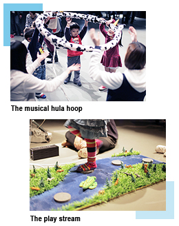 One of the innovative interfaces developed by the SCM students is a hula hoop connected to vibration sensors. The music changes according to the force that kids use to push the hoop. They can also step on points along a play stream to generate notes from different parts of a symphony.