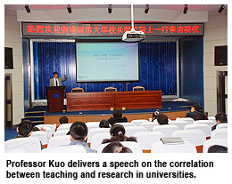 Professor Kuo also delivered a speech to teachers and students at Lanzhou University, titled “Clarifying some myths of teaching and research in universities”. With extensive statistical data and meticulous analysis, he clearly explained the complementary and interactive relations between teaching and research, and provided the audience with new insights on these two most important, yet seemingly exclusive, issues. Professor Kuo’s enlightening points aroused the audience’s interest and, due to overwhelming response, the speech was extended from the scheduled one hour to two and a half hours.