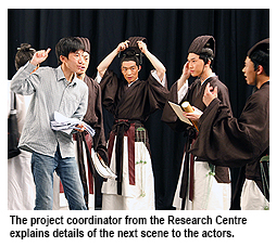 Actors from the China National Peking Opera Company, under the direction of Confucian experts Professor Peng Lin and his doctorate researcher Mr Zhang Defu of the Research Centre for Chinese Ritual Studies at Tsinghua University in Beijing, performed the rite, which is described in chapter one of the Book of Etiquette and Ceremonial, or Yili, in a virtual studio at the Run Run Shaw Creative Media Centre in June 2013.