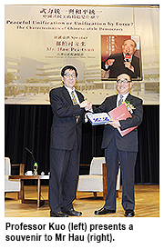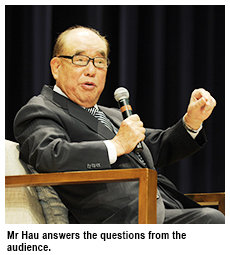 Mr Hau, aged 95, experienced the eight years of war against Japan and many other major events during World War Two. He has also served as the Chief Aide to Mr Chiang Kai-shek, President of the Republic of China. In his talk, he cited several paragraphs of Chiang’s diary to help explain the Kuomintang government’s strategies in the fight against Japan.