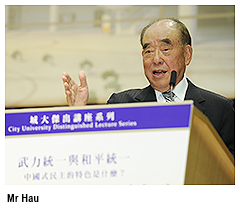 Chinese-style democracy could lead Chinese people down the road of freedom, democracy, peace and equal prosperity, according to Mr Hau Pei-tsun, former Premier of Executive Yuan of Taiwan, in his lecture at City University of Hong Kong (CityU) on 19 July.