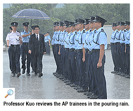 Professor Kuo commended the stamina of the auxiliary police trainees who had weathered the downpour throughout the ceremony, saying that the storm was testing their determination. He urged them to serve the Hong Kong public with pride and care.