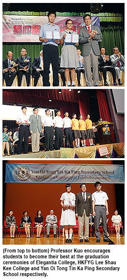 Professor Way Kuo, President of City University of Hong Kong (CityU), encouraged students to emulate persons of outstanding quality and become their best during speeches he made at the graduation ceremonies of three secondary schools in late June.Professor Kuo presented graduation certificates and various awards to students at the graduation ceremonies of Elegantia College, HKFYG Lee Shau Kee College and Yan Oi Tong Tin Ka Ping Secondary School on 25, 26 and 30 June respectively.