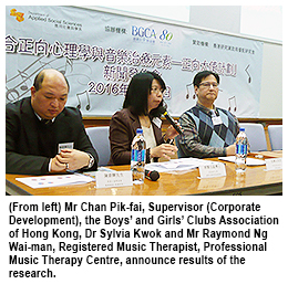 More than 1,700 Form 2 and Form 3 students were surveyed between September 2014 and December 2015 for the project, which was conducted by the Department of Applied Social Sciences at CityU in conjunction with the Boys’ and Girls’ Clubs Association of Hong Kong. Questionnaires were used to examine respondents’ levels of anxiety and depression as well as their subjective happiness. The project, titled “Integrating Positive Psychology and Music Therapy Elements – Positive Ambassador Project”, also studied risk and protective factors that may affect the students’ emotion and subjective happiness.