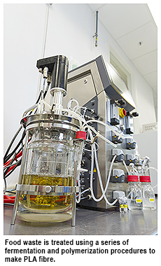 Bakery and restaurant food waste is collected and treated in the laboratory using a series of procedures including fungal hydrolysis to convert the food into micro molecules such as glucose, free amino nitrogen, vitamins and minerals. Bacterial fermentation then turns these nutrients into lactic acid. PLA is produced via lactic acid polymerization, which is then turned into fibre.
