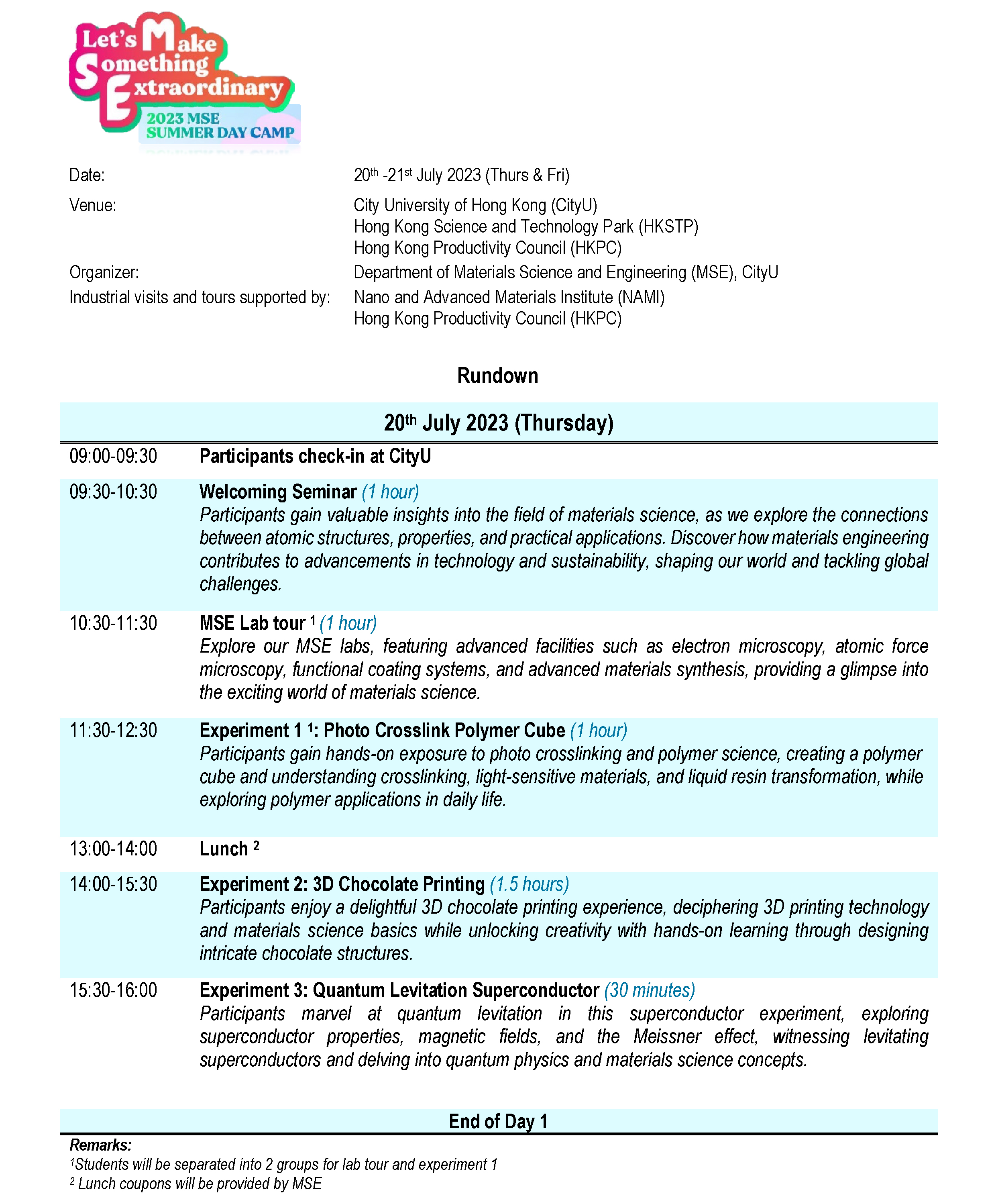 Home About us MSE Summer Day Camp 2023 Latest Events MSE-COSDAF Joint Distinguished Lecture – Prof. Pengfei WANG (28 April 2026) Gter (寄托天下) Live Information Session (20 April 2026) MSE Seminar – Dr. Wenbo XIE (16 April 2026) MSE Seminar – Prof. Shi-Zhang QIAO (30 March 2026) MSE Seminars (23 March 2026) MSE Summer Day Camp 2023 20 Jul 2023 (Thu) - 21 Jul 2023 (Fri) Be the first one to register and Make Something Extraordinary with us this summer!