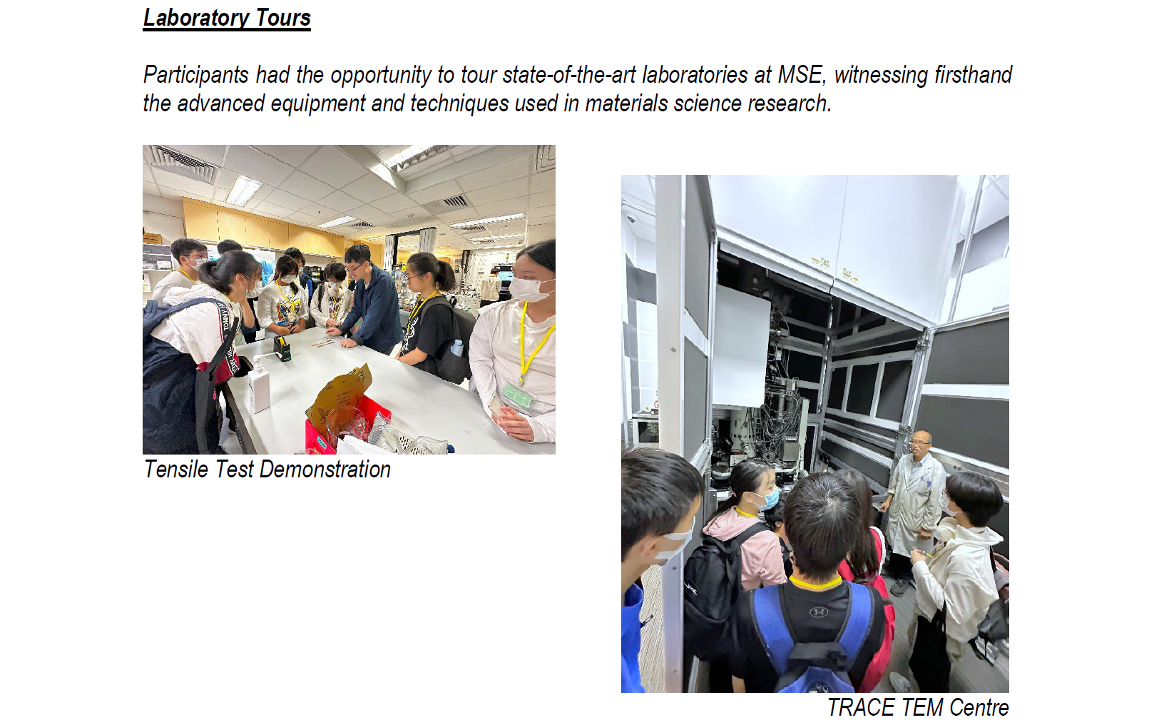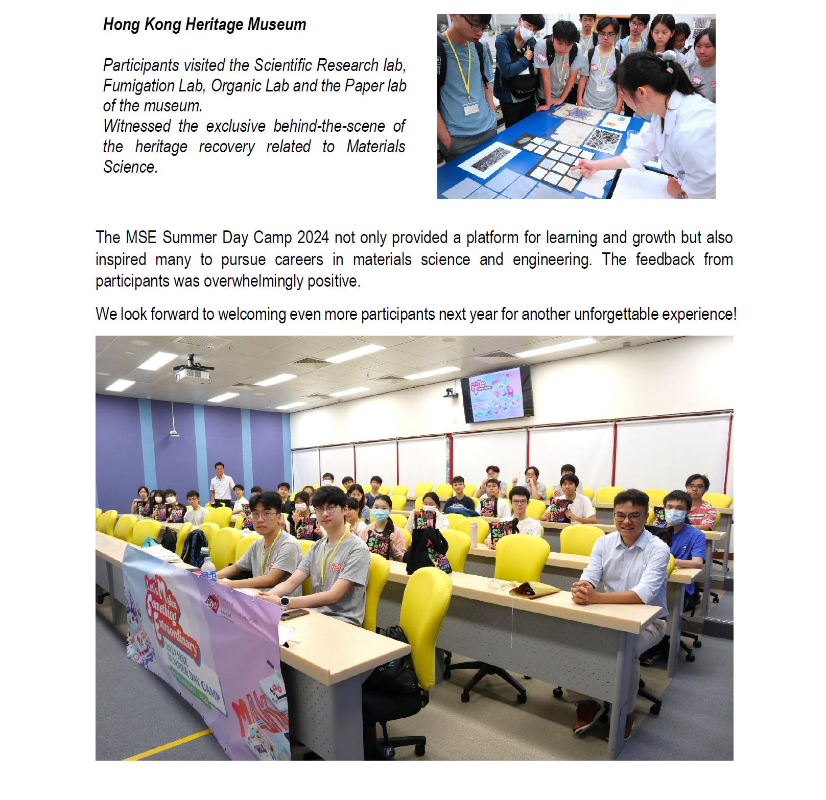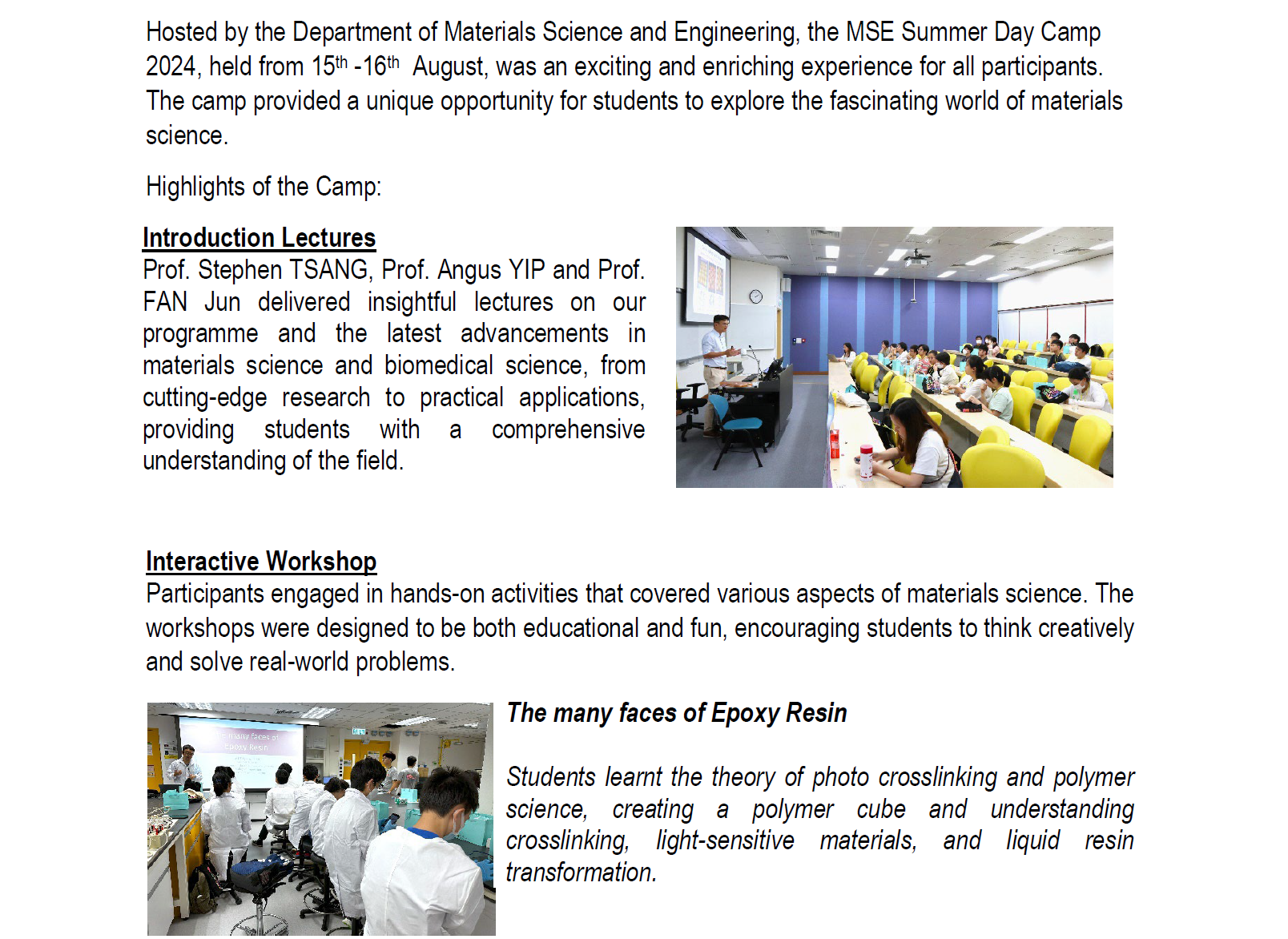 Home About us MSE Summer Day Camp 2024 Successfully Held Latest Events MSE-COSDAF Joint Distinguished Lecture – Prof. Pengfei WANG (28 April 2026) Gter (寄托天下) Live Information Session (20 April 2026) MSE Seminar – Dr. Wenbo XIE (16 April 2026) MSE Seminar – Prof. Shi-Zhang QIAO (30 March 2026) MSE Seminars (23 March 2026) MSE Summer Day Camp 2024 Successfully Held 15 Aug 2024 (Thu) - 16 Aug 2024 (Fri)