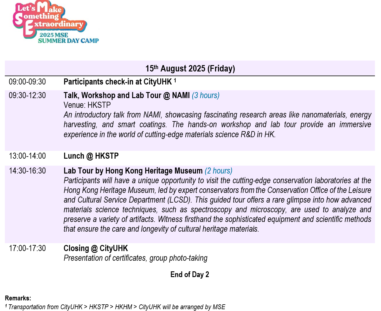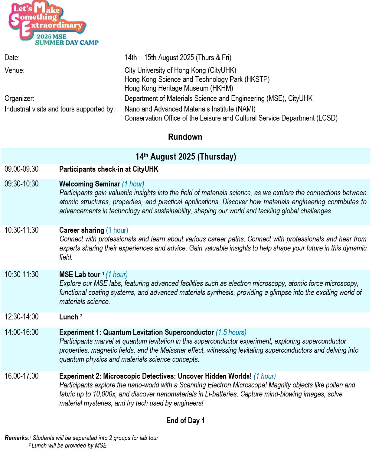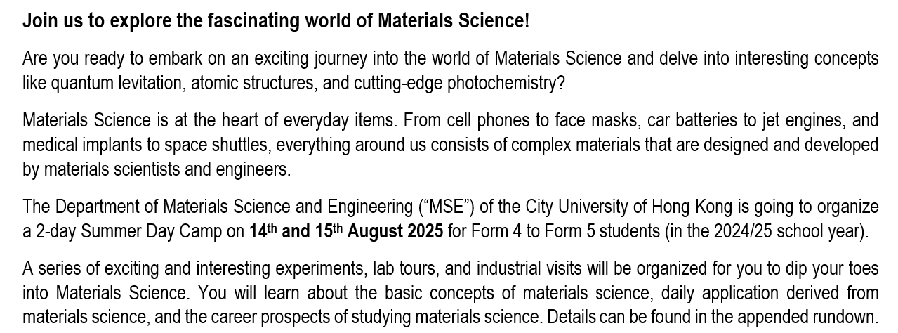 Home About us 2025 MSE Summer Day Camp Latest Events MSE-COSDAF Joint Distinguished Lecture – Prof. Pengfei WANG (28 April 2026) Gter (寄托天下) Live Information Session (20 April 2026) MSE Seminar – Dr. Wenbo XIE (16 April 2026) MSE Seminar – Prof. Shi-Zhang QIAO (30 March 2026) MSE Seminars (23 March 2026) 2025 MSE Summer Day Camp 14 Aug 2025 (Thu) - 15 Aug 2025 (Fri) Be the first one to register and Make Something Extraordinary with us this summer!