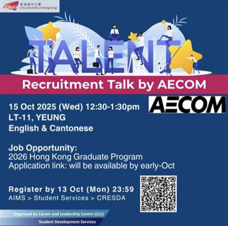 We are pleased to invite you to an exciting recruitment talk, featuring one of our alumni who is now serving as the Associate Director at AECOM. This is a fantastic opportunity to gain insights into her professional journey and explore potential career paths within AECOM.