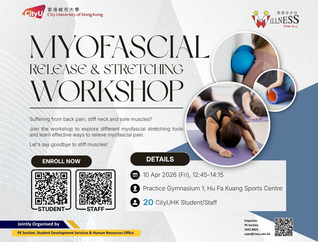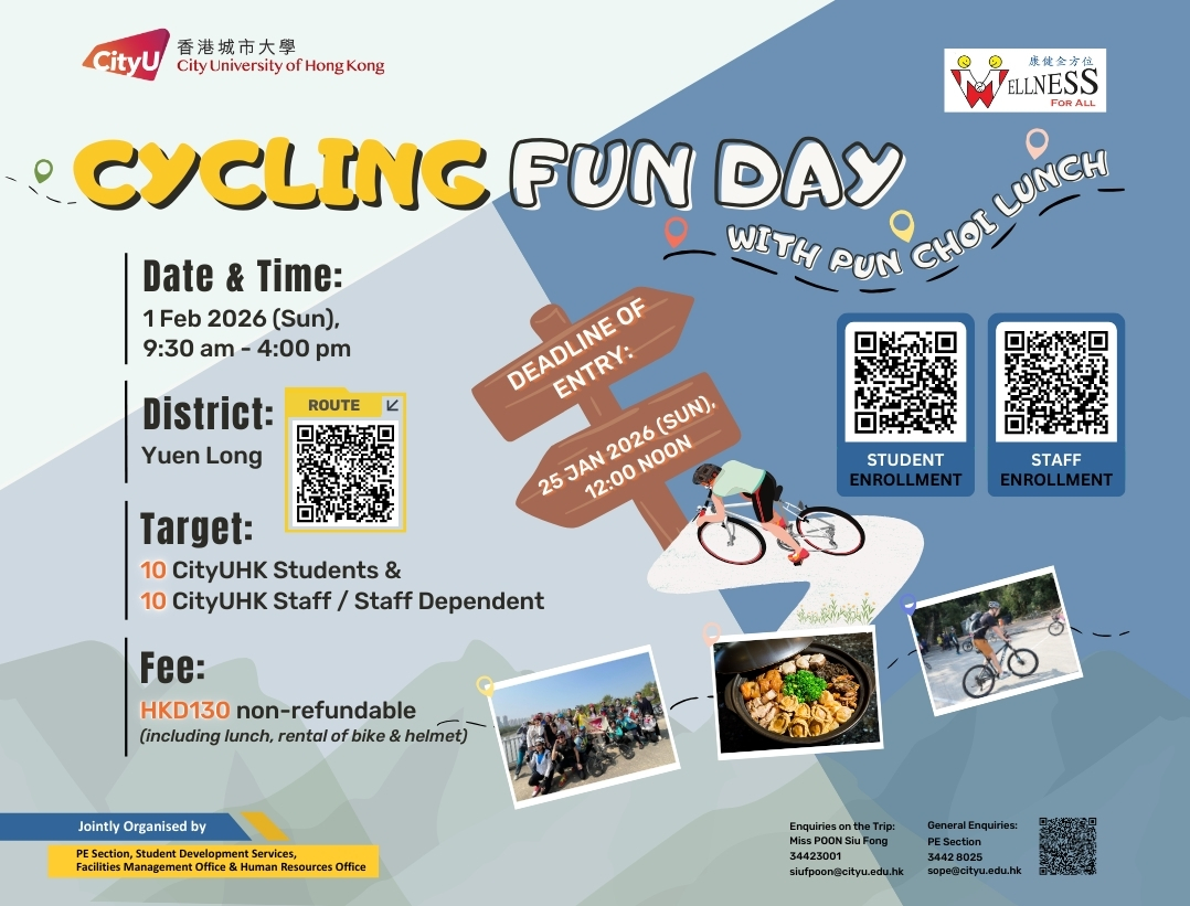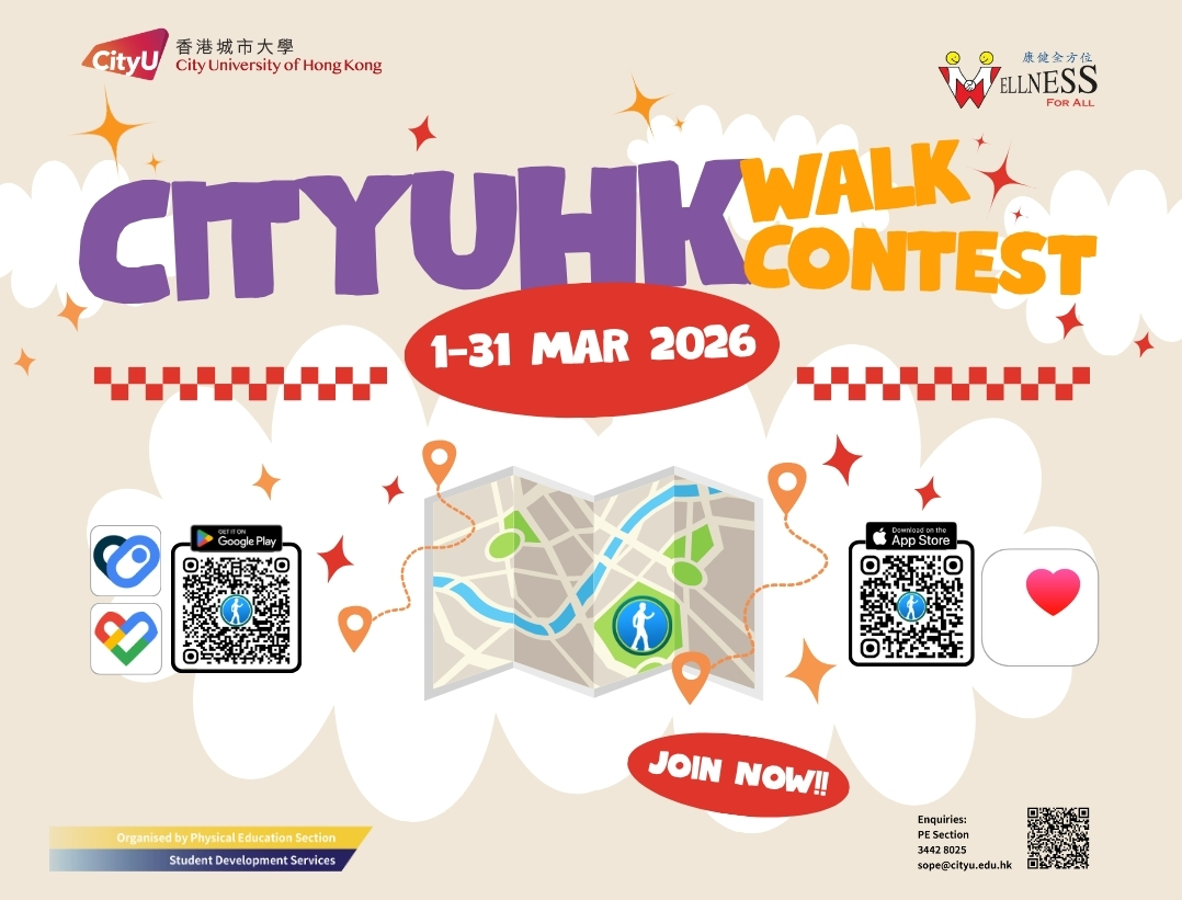 "Wellness For All" is an evidence-based, year-round campaign to promote active lifestyles, physical well-being, and enhanced health, fitness, and quality of life across the CityUHK community through innovative total wellness programming.
