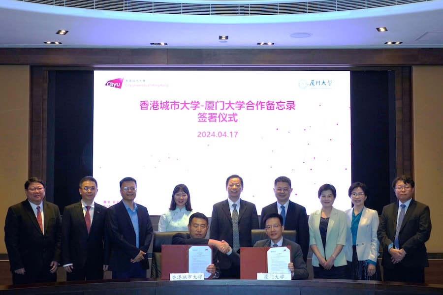 Professor SHI Dalin, Vice-President of Xiamen University, led a delegation to visit CityUHK on 17 April 2024. They were warmly welcomed by Professor LU Chun, Vice-President (Mainland Strategy), Professor LI Juan, Associate Vice-President (Mainland Strategy), Professor WANG Xin, Dean of the College of Science, Professor LEUNG Mei-yee, Dean of the School of Energy and Environment, and Ms. SNG Jingli, Director of the Office of the President. The two universities signed a cooperation memorandum to further expand and deepen their exchange and collaboration, and strengthen their in-depth cooperation in areas such as marine science and chemistry.