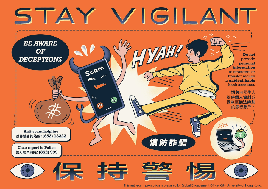 Be aware of deceptions such as telephone and internet scams! Scammers may impersonate different identities, for example, government officials (Police, Immigration, Department of Health, etc.) and staff of different organisations (couriers, banks, etc.). They may offer you good deals or take advantage of your kindness or fears. They can use various fraudulent tricks to ask for personal information and make you believe that you are in certain trouble, and eventually convince you that wiring money to their accounts is a way to solve the problems. Some fraudsters may even be able to provide your personal information obtained from illegal channels when approaching you. Please stay vigilant at all times! NEVER give out your personal information or transfer any money to a suspicious person or organisation. If in doubt, contact the Anti-Deception Coordination Centre of the Hong Kong Police Force at (852)18222 for assistance.