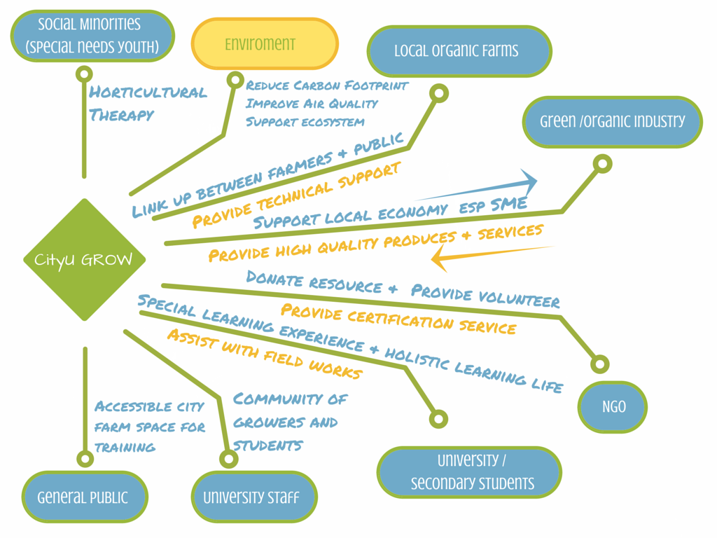 GROW CityU engages in promoting a sustainable community through collaborating with university departments, organizations, schools, local farms and the public.
