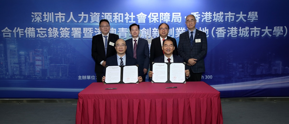 Witnessed by Mr Chen Qing, Vice Mayor of the Shenzhen Municipal People’s Government (back, 2nd from left), Mr Zhu Wu, Deputy Secretary-General of the Shenzhen Municipal People’s Government (back, 1st from left), Dr Raymond Leung Siu-hong, CityU Council Member and Board Chairman of CityU Enterprises Limited (back, 2nd from right) and Professor Raymond Chan, CityU Acting Vice-President (Student Affairs) (back, 1st from right), Professor Michael Yang Mengsu, CityU Vice-President (Research and Technology) and Chairman of the HK Tech 300 Executive Committee (front, right) and Mr Zhao Zhongliang, Director of the SZHRSS Bureau (front, left)  signed an MoU today to support innovation and entrepreneurship among young people in Hong Kong.