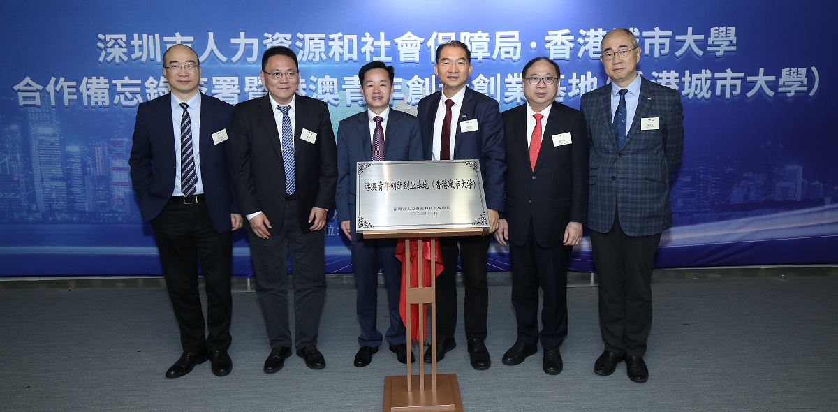 Guests co-hosted a plaque-unveiling ceremony of the “Hong Kong-Macao Youth Innovation and Entrepreneurial Base (City University of Hong Kong)”. From left: Mr Zhao Zhongliang, Director of the SZHRSS Bureau; Mr Zhu Wu, Deputy Secretary-General of the Shenzhen Municipal People’s Government; Mr Chen Qing, Vice Mayor of the Shenzhen Municipal People’s Government; Professor Michael Yang Mengsu, CityU Vice-President (Research and Technology); Dr Raymond Leung Siu-hong, CityU Council Member and Board Chairman of CityU Enterprises Limited; and Professor Raymond Chan, CityU Acting Vice-President (Student Affairs).