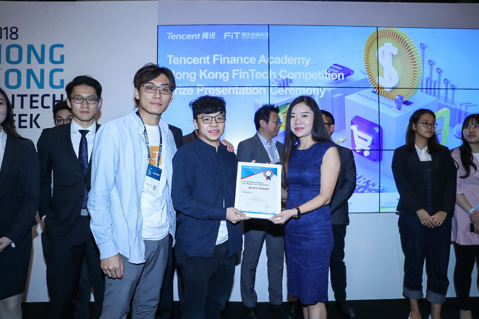 Rainix He (left) and team win a merit award in an e-payment system competition.