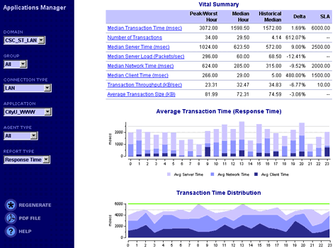 With prolonged use of the application with monitoring, the trend of the application response time, network delay, server loading and throughput can be easily obtained, thus provides network management and server administrators with valuable information in traffic base lining, troubleshooting and capacity planning.