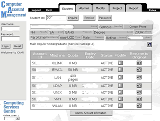 CAM also serves to maintain computer accounts as a life cycle owned by student alumni (both Basic service and Full service) and ex-staff alumni.
