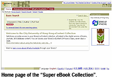 CityU is a well-developed tertiary institution with web-teaching successfully applied to the general education of Chinese culture. During this academic year, a common e-learning platform, Blackboard Academic Suite, has been deployed. Students can access various kinds of learning materials and build their own e-learning files. The “Super eBook Collection” will complement this e-learning platform by letting students use web resources to attain the IT skills used in searching and e-learning and to have online discussions with instructors and friends on different academic topics.