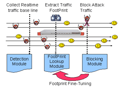 The "attack footprints lookup" module will then try to find the pattern/characteristics of the attack traffic. This is achieved by analyzing about 17 parameters that can be found in every packet. These parameters include the packet checksum, packet size, TTL, ports, sequences no, etc. Based on these parameters, the "attack footprints lookup" module creates a highly accurate, real-time signature of this specific attack.